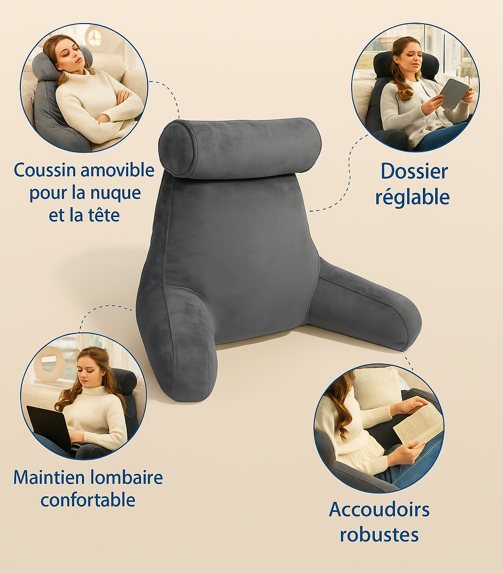 Notre coussin ergonomique combine un appui-tête amovible, un dossier réglable, un soutien lombaire et des accoudoirs robustes pour transformer chaque moment de lecture en expérience de bien-être.